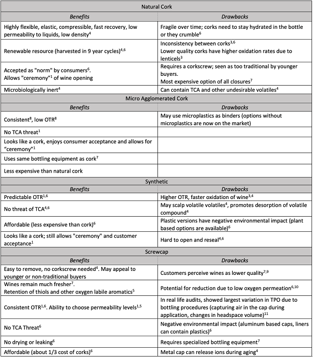 Table 1: Several different closure types are currently used to seal commercial wine bottles. Each has its benefits and drawbacks.