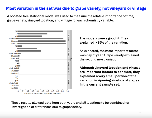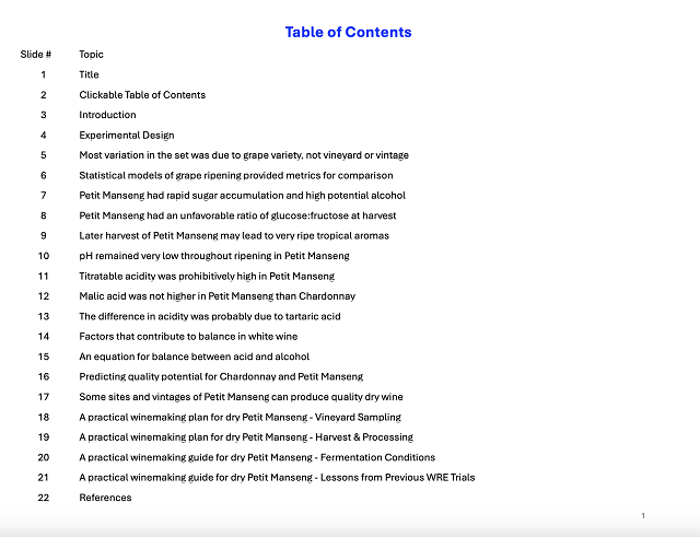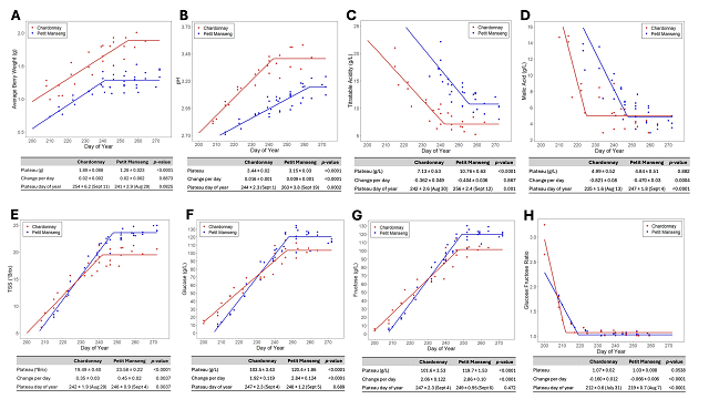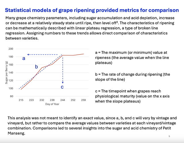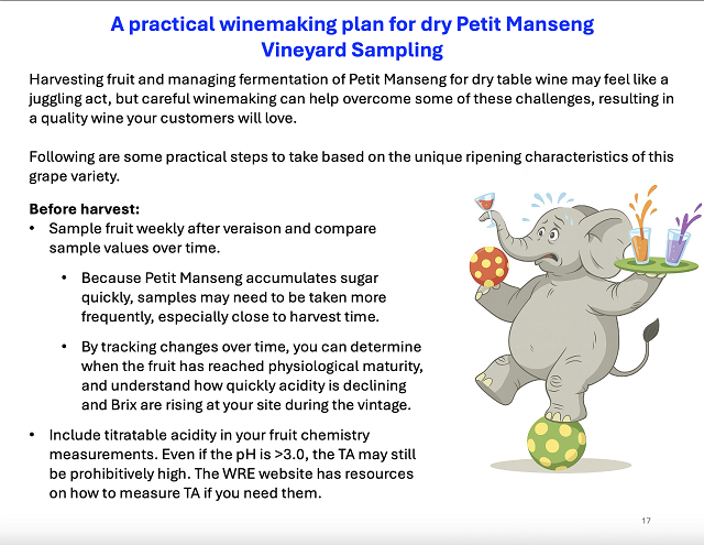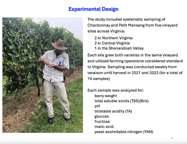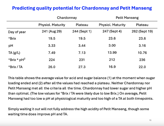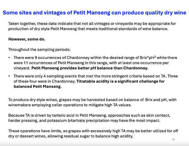 To help winemakers better answer these questions, WRE has conducted several studies of Petit Manseng including a systematic study of ripening kinetics in collaboration with Dr’s Beth Chang and Dennis Cladis of Virginia Tech’s Food Sciences Department as well as several winemaker-initiated experiments testing harvest timing and winemaking approaches.