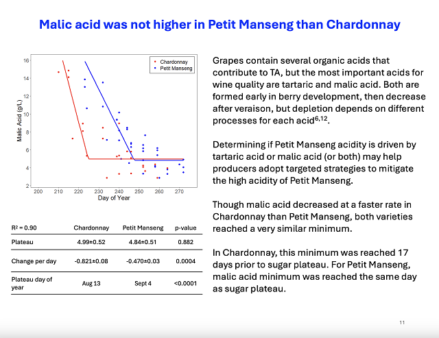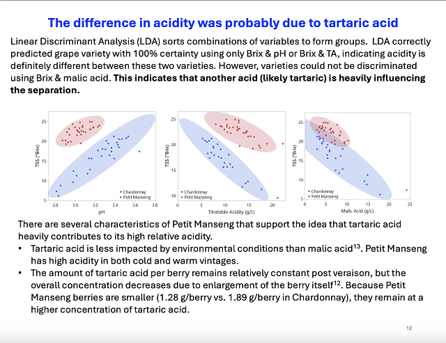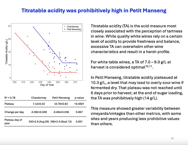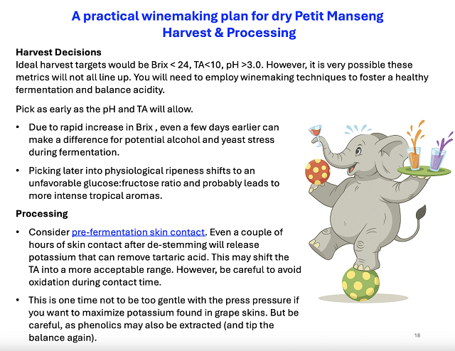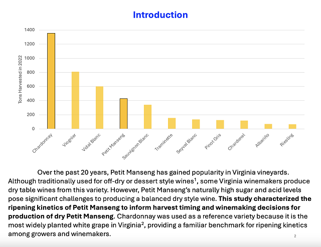 As a non-traditional variety of Vitis vinifera, there are few “standards” to adhere to when making Petit Manseng. The ripening kinetics of Petit Manseng are not as well understood as those of more common varieties, such as Chardonnay, leading to questions about when to harvest to make the most of potential fruit quality. Also, we don’t really understand the best way to make this wine given its unique chemistries.