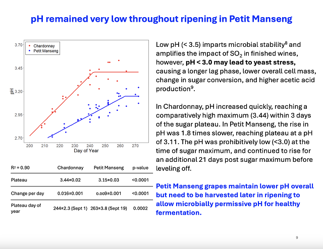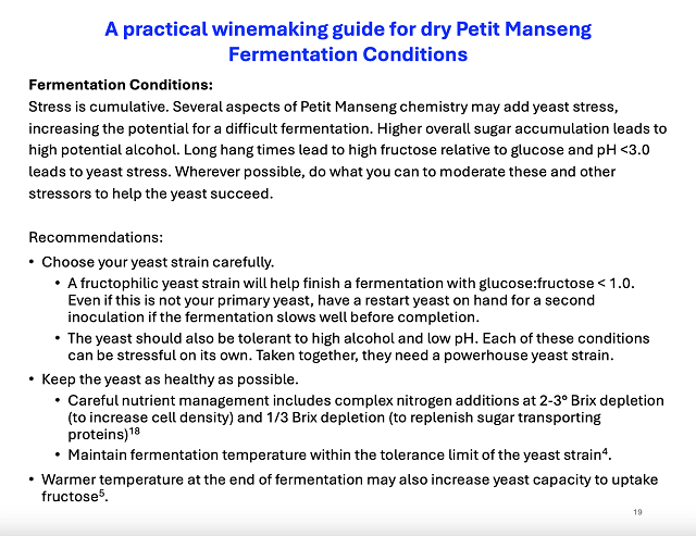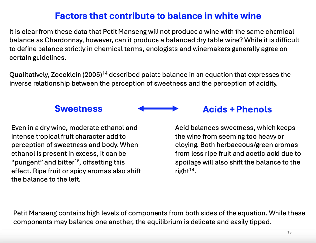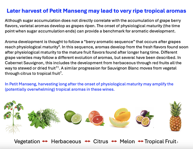 However, the ripening kinetics of Petit Manseng often present a challenge when trying to balance the alcohol, acidity, and distinctively strong tropical aromas to craft a harmonious wine. Petit Manseng can exhibit rapid Brix accumulation with very little acid depletion, leading to very high potential alcohol (15-16%) with high acidity (10 g/L titratable acidity or more). Petit Manseng wines have unique fruity and spicy aromas such as pineapple, peach, melon, grapefruit, nutmeg, honey, wildflowers, box tree, and roasted coffee bean5. Notable levels of thiols6 and esters7 have been reported in wines made from Petit anseng grapes and contribute to these descriptors. Enduring long hang times to reduce acidity also allows strong tropical flavors and aromas to develop, to the point some winemakers find them overpowering or out of balance.