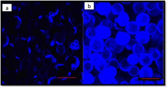 Figure 2: Yeast cell walls stained for the presence of chitin. (a) S. cerevisiae (b) S. paradoxus. From Ndlovu et al (2018)