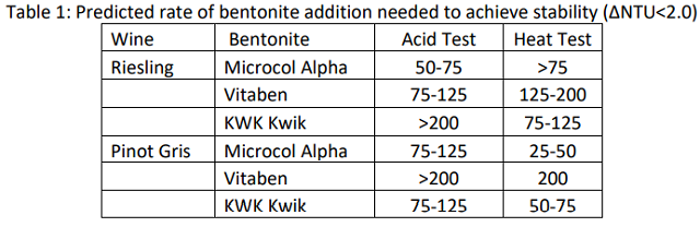 Two wines, a Riesling and a Pinot Gris, were fined with six doses of bentonite and tested for protein stability using a Bentotest and a fast heat test (Table 1, Appendix A). Each wine was tested with three different bentonite products. The acid test predicted a higher rate of bentonite addition in four of the six tests while the heat test predicted a higher rate in two of six tests. There was not agreement between tests for any of the six wine/bentonite pairs. At times these differences differed in predicting stability within 25 g/hL of bentonite, but differences as large as 100 g/hL were seen.