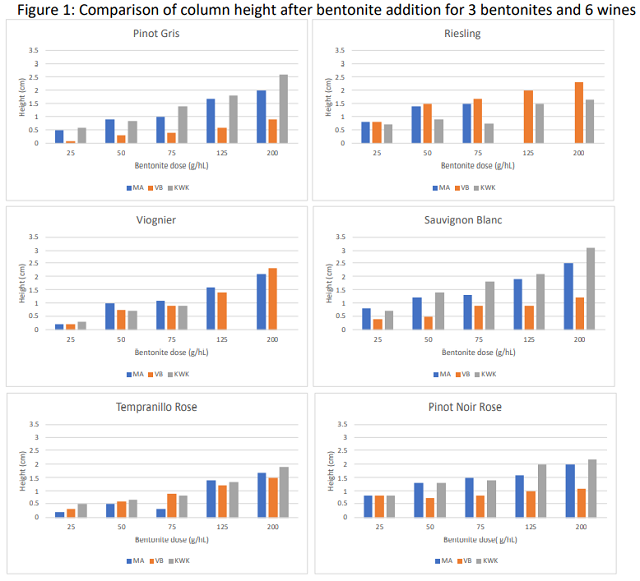 Relative compaction among bentonite products varied considerably depending on the wine (Figure 1, 2). For example, Vitaben showed very good compaction in Pinot Gris, with the shortest column at all doses, but much less compaction in Riesling), with the highest column of the products tested.