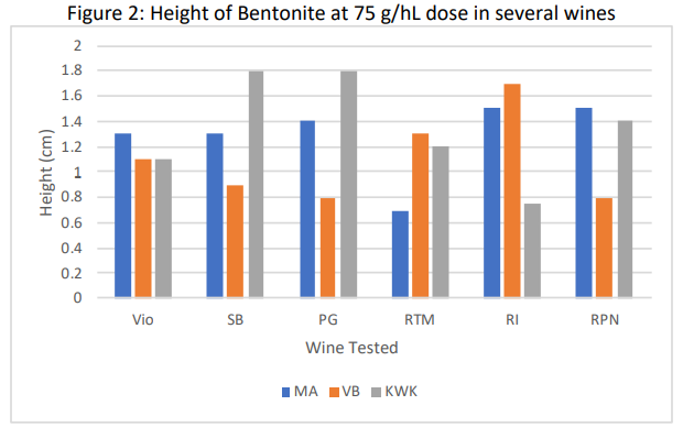 Also, the height of the column at a given rate differed by wine for each product. For example, at 75 g/hL each bentonite product had very different column height depending on the wine (Figure 2). Though bentonite settling is affected by the properties of the bentonite itself (sodium vs. calcium), it is also affected by the wine matrix. There is differential packing of bentonite sheets in different chemical matrices of wine5.