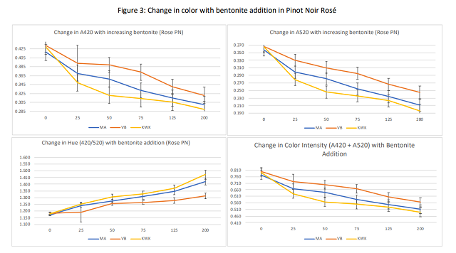 In the Pinot Noir Rosé, all three bentonite products showed a decrease in A420, A520, and color intensity, as well as an increase in hue (Figure 3). These trends are consistent with stripping of anthocyanins. When comparing products in all measures of color loss, the same trend appears in each case: KWK>MA>VB. This trend was also seen in the opposite direction with the shift in hue from red to yellow.
