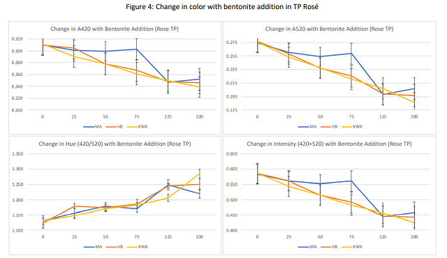 - Bentonite addition led to color stripping in Rosé. KWK and Microcol alpha stripped more color in one of the two wines tested. There was not as clear of a difference in the second wine tested.