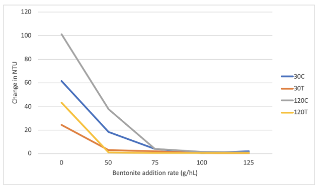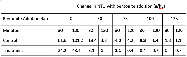 For the acid test, 1 mL of Bentocheck reagent was added to 10 mL of bentonite-fined wine. Tubes were mixed by inversion and incubated 1 minute prior to checking turbidity. For the heat test, wine was heated for 6 hours at 80°C and allowed to cool before measuring final NTU. Turbidity measurements before and after treatment with acid (Bentotest) or heat were recorded. A change in turbidity <2.0 NTU was considered stable. In this trial, wines were not filtered prior to heating or treatment with Bentotest reagent.
