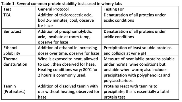 Several tests can be utilized for protein stability. These tests differ by the basis of protein precipitation, usually relying on either heat or acid to hasten instability. In this study, two testing methods were used to predict the rate of bentonite needed for stability: the Bentotest (an acid-based test) and the fast heat test.