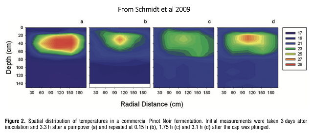In a study looking at the formation of temperature gradients in red wine fermentations, Schmid et al (2009) measured the temperature in the cap at several locations during an active fermentation as well as at several depths of the fermentation before, during, and after cap management. In a 6-ton fermentation of Pinot Noir, there was up to 12°C difference in temperature between the cap and the liquid and a 6-8°C difference between the center and sides of the cap. The gradient was not always fully dissipated during routine cap management (Schmidt et al 2009). The figure shown below (from Schmid et al 2009) indicates heat at various depths in the tank over time. Panel (a) shows heat built up 3 hours after a 10-minute pump over, (b) shows heat immediately after punch down, and (d) shows the heat built up after 3 hours. Here, the heat in the cap 3 hours after pump over (a) is higher than 3 hours after punch down (d), indicating the punch down did a better job dissipating heat. However, panel (b) shows that this was incomplete homogenization. It is important to note that a temperature gradient was also found in three other fermentations studied, but to a lesser extent. The authors hypothesize the magnitude of the temperature gradient is affected by grape variety and processing, however do not elaborate on those differences.