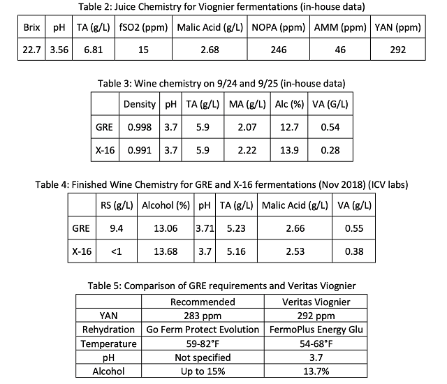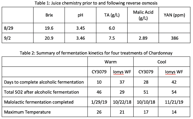 Chardonnay grapes were harvested on August 29 and chilled overnight, then whole cluster pressed into tank with the addition 20 ppm SO2. After cold settling, on September 1, reverse osmosis was performed on the juice with 13% loss of volume/concentration. Concentrated juice was racked into barrels of comparable age, cooper and dimension (Ana Selection J M 15 or T M 15) in replicate pairs so that there were two barrels per temperature/yeast pair. Juice chemistry was measured before and after RO operation. All barrels received juice from the same tank after reverse osmosis.
