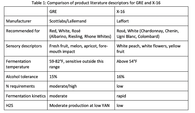 Barrels were inoculated with yeast rehydrated in 1.25X Goferm Evolution. For the purpose of the experiment, no acid additions were made. After inoculation, two barrels of each yeast group were placed in the cellar for fermentation (“cool” treatment) while two barrels were placed in the tank room for fermentation (“warm” treatment). It is estimated the cellar was 60°F and the tank room was 72°F during fermentation. Temperature was monitored during fermentation but not otherwise manipulated. Though both yeasts have high nutrient requirements and higher temperatures may increase nutrient utilization, YAN was measured to be 386 ppm, well above that requiring nutrient addition, therefore no nutrient additions were made. Wines were allowed to go through full malolactic fermentation without inoculation prior to the addition of 45 ppm SO2. Wine was aged on lees with battonage once per week beginning when specific gravity dipped below 1 and continuing until sampling for the sensory session.