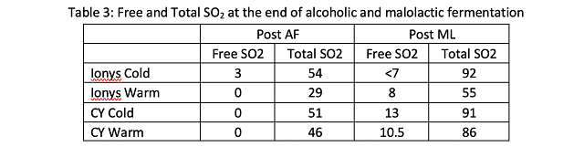 To investigate potential causes of slow malolactic fermentation in the warm CY3079 barrels, free and total SO2 were measured at the end of alcoholic fermentation (Table 3). All total SO2 levels were within a range that is expected to allow malolactic fermentation. Slow malolactic fermentation in these barrels may have been due to high nutrient demand caused by high fermentation temperature leaving little nutrient for malic acid bacteria. The CY3079 barrels fermented at warm temperature also had a higher alcohol than the other barrels (14% compared to 13.4% and below for the other barrels), which may have further inhibited malic acid bacteria. It is unexpected to have a higher level of alcohol in the wine with a warmer fermentation. This may be due to a chaptalization error.