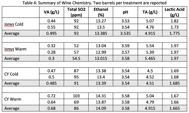 The barrels inoculated with CY3079 and fermented at warm temperature ended malolactic fermentation with notably higher volatile acidity than the other treatments (Table 4), due to the extended period of malolactic fermentation. By contract, the barrels inoculated with Ionys WF and fermented at warm temperature had the lowest volatile acidity at the end of malolactic fermentation. These barrels also finished with the lowest total SO2 and alcohol, and the highest TA. When compared, each Ionys barrel finished with higher acidity than each CY3079 barrel from the same temperature regime, indicating Ionys does help to retain acidity. For all wine chemistry measures, values were very similar in replicate barrels.