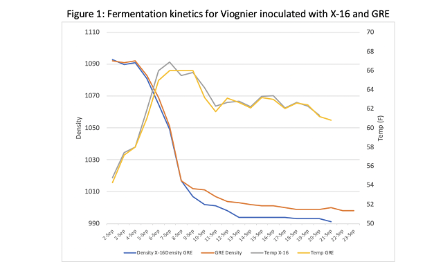 Inoculation differences: The initial dose of yeast at inoculation was an additional variable for this trial. Ionys WF is a yeast not usually used in white wines, and based on the experience of the winemaker, this yeast can be slow at lower temperatures. In order to encourage the completion of fermentation, this yeast was inoculated at a rate of 25 g/hL. CY3079 is a strong barrel fermenter that can produce off odors if overly vigorous and, in the experience of the winemaker, produces more pleasant wines when inoculated at 14 g/hL. The decision was made to use different inoculation doses to test the best quality wine produced from each yeast.