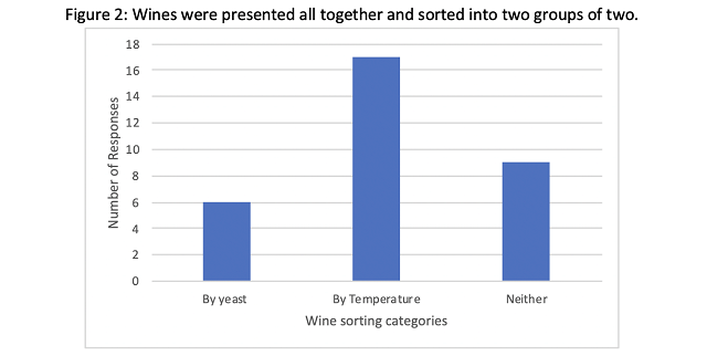 When a tasting panel of wine producers was presented with all four wines in randomly numbered glasses and asked to sort them into two groups of two, they were most likely to be sorted by temperature (Figure 2), indicating that temperature was more important than yeast group in sensory characteristics of the wine. However, 9 responders sorted in a way that reflected neither yeast group nor temperature. There was no significant difference in preference among the wines (Q=1.81, p=0.61).
