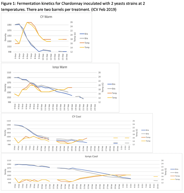 Chardonnay is the most widely planted wine grape variety in Virginia1 and is vinified in many different styles. Two elements that affect Chardonnay style are fermentation yeast and fermentation temperature. In this study, wine made with Ionys WF (Scottlabs) yeast, a yeast strain with properties of acid retention is compared to wine made with CY3079, a classic Chardonnay yeast in broad use. Each yeast strain was tested at cool (15°C) and warm (22°C) ambient temperatures. Ionys WF showed slower fermentation kinetics with greater acid retention. Warm fermentation with Ionys yeast had the lowest total SO2 and lowest volatile acidity at the end of fermentation. In triangle tests comparing CY3079 fermentation at cold and warm temperature, the wines were found to be significantly different. Comparison of wines fermented at warm temperature with different yeasts were also different. Wine fermented with CY3079 at warm temperature received higher scores for body than those fermented cold or with Ionys yeast.