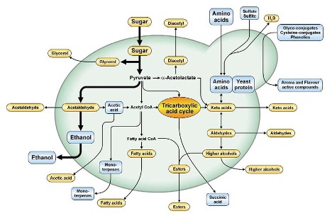 Saccharomyces cerevisciae is the primary species of yeast used in commercial wine production. Despite a single domestication event in Mesopotamia around the same time as domestication of wine grapes themselves2, it remains so genetically diverse that no one strain accurately portrays the whole species2. The primary metabolic function of Saccharomyces cerevisciae in wine production is the metabolism of sugar into ethanol with the coupled release of energy. However, complex cellular machinery is also at work to build and maintain cellular components through alternative pathways. It is the work of these pathways that leads to the production of volatile aromas and flavors that gives wine its complexity and diversity3. At any given time, hundreds of substrates are taken up into the yeast cell, transformed by enzymatic pathways, with end products expelled into the environment or used by the yeast cell itself. Though most S. cerevisciae strains share most of these pathways in common, the extent to which any one pathway functions is determined by both genetic differences and environmental influences.3 It is the differences in the functioning and regulation of these enzymes that characterize the myriad of yeast strains that are commercially available for wine production.