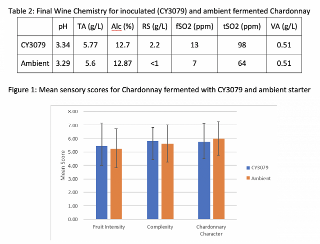 In a triangle test of warm fermented wines inoculated with CY3079 vs Ionys WF, 24 out of 31 respondents were able to distinguish which wine was different, indicating the wines were significantly different (Z=5.02, p< 3x10-5). There were no significant differences in scores for fruit intensity (F=0.82, p=0.37), floral intensity (F=.01, p=0.93), or minerality (F=1.66, p=0.2). Fermentation with CY3079 had a small but significantly higher perception of body (F=5.26, p=0.03) with an average of 5.98 (SD=1.23) vs. 5.18 (SD=1.43) for the fermentation with Ionys WF yeast. Once again, this may be due to the higher alcohol level in the warmer fermentation. Several respondents also mentioned a perception of acidity in the Ionys fermentation, which may have diminished the perception of body. Several also mentioned a lactic or oxidized character to the CY3079 fermentation.