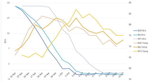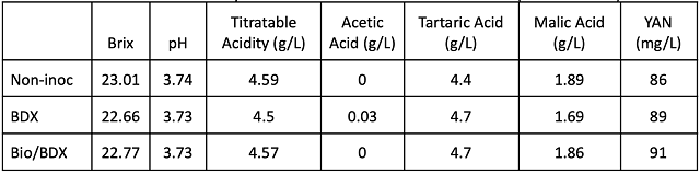 The initial chemistry for fruit in each of the treatments was nearly identical (Table 1). The fruit that was inoculated with BDX began fermentation sooner and completed alcoholic fermentation earlier than either of the other two treatments (Figure 1). The non-inoculated treatment did not show Brix depletion for six days. Once it began fermentation, it progressed at a pace comparable to the other two treatments. The bin that was initially treated with Biodiva began fermentation more slowly. The pace increased on 9/28, the day after BDX was added. Sequential inoculation is part of the use of non-Saccharomyces yeast, as this species of yeast is not meant to be fully fermentative. As a result of differences in fermentation kinetics, the fruit inoculated with BDX and Biodiva & BDX had many more days of post-fermentation (alcoholic) maceration than the fruit allowed to ferment without inoculation with commercial yeast.