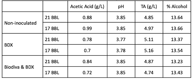 The same day (9/22), one bin was inoculated with 10 g/hL BDX yeast rehydrated in 10 ghL GoFerm Protect Evolution. A second bin was inoculated with 25 g/hL BioDiva. On 9/27, the Biodiva inoculated bin received 10 g/hL BDX yeast rehydrated in 10 g/hL GoFerm Protect Evolution. Bins were lightly punched down and gassed until signs of fermentation began, after which they received three punchdowns daily. On 9/24, 1.5 g/L tartaric acid was added to each bin. Fermentations were checked for Brix and temperature once daily. At the completion of fermentation, bins were gassed each day before pressing on 10/12 for a total of 21 days of maceration. After pressing, wine was allowed to settle, then transferred to comparable oak barrels for malolactic fermentation. Wine was treated with 70 ppm SO2 at the completion of malolactic fermentation. Native and Biodiva/BDX treatments completed malolactic fermentation on 12/3 while the BDX treatment completed fermentation on 1/5.