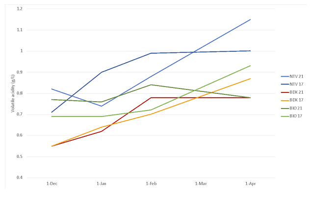 After completion of fermentation, wine produced from inoculated fermentations (BDX, Biodiva & BDX) had lower acetic acid concentration than the non-inoculated wine (Table 2). The fermentation inoculated with BDX only had lower acetic acid than the Biodiva/BDX wine. This may be due to overall lower pH, or to stressed conditions at the end of Biodiva fermentation prior to BDX inoculation. After aging for several months, the wines produced by fermentation without commercial yeast had the highest level of acetic acid, while the wine produced by Biodiva & BDX inoculation had the lowest acetic acid concentration (Figure 2). Ethyl acetate is another component of volatile acidity, and is a common spoilage compound produced early in fermentation. The non-inoculated fermentation produced 147 mg/L ethyl acetate while the BDX fermentation produced 58 mg/L and the Biodiva/BDX fermentation produced 53 mg/L (ICV Labs, May 2022). According to ETS, the limit of detection of ethyl acetate ranges from 90-150 mg/L depending on the wine matrix (ETS labs), so these differences may or may not have been detectable.