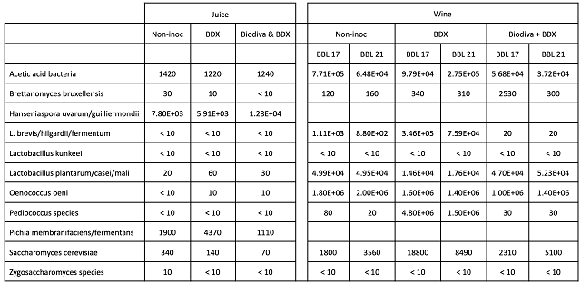Table 3: Comparison of microbes in juice and wine for three treatments of Cabernet Franc (ETS Labs). All values are reported as cells/mL.