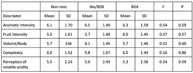 Despite the differences in chemistry and microbiology among the wines, there were no significant differences in sensory scores for aromatic intensity, fruit intensity, volume/body, complexity or perception of volatile acidity (Table 4), indicating these differences were below threshold or otherwise masked by other compounds in the wine. None of the fermentation conditions seemed to affect perception of complexity or spoilage.