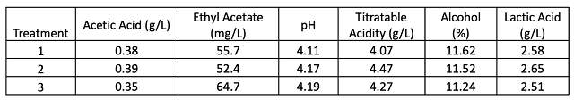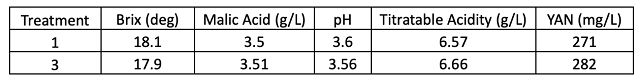 Table 2: Wine chemistry for three treatments of Cabernet Franc (ICV Labs)