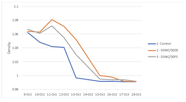 Fruit chemistry was measured for treatments 1 and 3 only; all metrics were very similar (Table 1). Inclusion of whole clusters led to slower overall start to fermentation, but the fermentation was steady once it had begun (Figure 1).