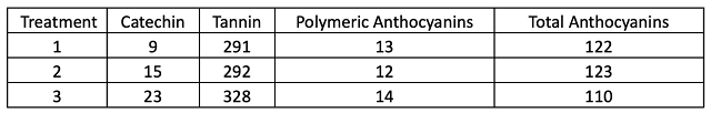 Table 3: Phenolic measurements for three treatments of Cabernet Franc (mg/L) (ICV Labs)