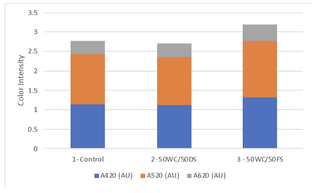 The effect of higher stem content can be seen in several of the wine metrics. pH values increased as stem content increased, likely due to potassium leaching from stems (Table 2). Stems contain tannins and tannin subunits such as catechin. Catechin increased proportionally with increased stem inclusion. Tannins only increased with treatment 3 (Table 3). Though anthocyanin values were lowest in treatment 3 (Table 3), color intensity (Figure 2) and perception (Table 4) were highest in this treatment, demonstrating the complexity of color expression in wine.