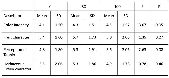 Sensory analysis was completed by a panel of 32 wine producers. Due to restrictions put in place during COVID-19, sensory analysis was completed using shipped samples. Each wine producer received three wines in identical bottles, filled on the same day, each coded with random numbers. Two of the bottles contained the same wine while the third bottle contained the different wine. Participants were asked to identify which wine was different (a triangle test). There were four tasting groups with the unique wine in the triangle test balanced among the groups. Participants were then asked to score each wine on a scale of 0 to 10 for color intensity, fruit character, perception of tannin, and herbaceous/green character. They were also given open ended questions to describe the wines. Results for the triangle test were analyzed using a one-tailed Z test. Descriptive scores were analyzed using repeated measures ANOVA.