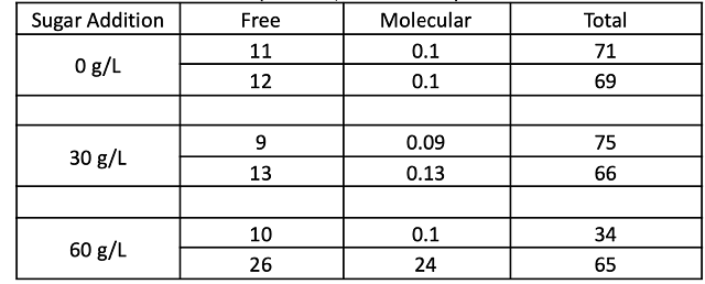 Table 3: Sulfur dioxide chemistry (ppm) for three treatments of Cabernet Sauvignon (ICV labs, March 2021)