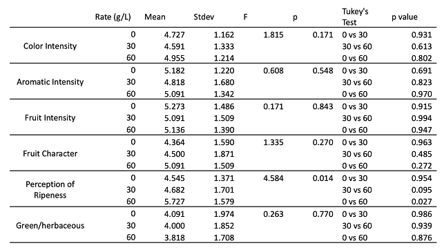 Sensory analysis was completed by a panel of 26 wine producers. Due to restrictions put in place during COVID-19, sensory analysis was completed using shipped samples. Each wine producer received three wines in identical bottles, filled on the same day, each coded with random numbers. Two of the bottles contained the same wine while the third bottle contained the different wine. Participants were asked to identify which wine was different (a triangle test). There were four tasting groups with the unique wine in the triangle test balanced among the groups. Participants were then asked to score each wine on a scale of 0 to 10 for color intensity, aromatic intensity, fruit intensity, fruit character (bright/red to dark/black), perception of ripeness, and green/herbaceous character. They were also given open ended questions to describe the wines. Descriptive scores were analyzed using repeated measures ANOVA.