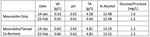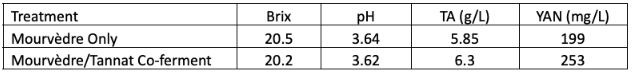 Addition of 12% Tannat led to only small changes in the chemistry of the must (Table 1). The TBin that contained the co-fermentation had more heat than the two bins containing Mourvèdre only (Figure 1). Fermentation kinetics stalled somewhat in the co-fermentation bin, leading to a longer time needed to complete fermentation. There are few differences in finished wine chemistry (Table 2). The co-fermented wine has higher alcohol, however this could be due to differences in yield leading to differential chaptalization. This wine also has slightly higher volatile acidity. This may be due to stress of higher temperature fermentation, or longer time to achieve Brix dryness. All of the wines have a small amount of residual sugar.
