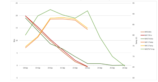 Figure 1: Fermentation kinetics for two bins of Mourvèdre and one bin of Mourvèdre/Tannat co-ferment (in-house data)