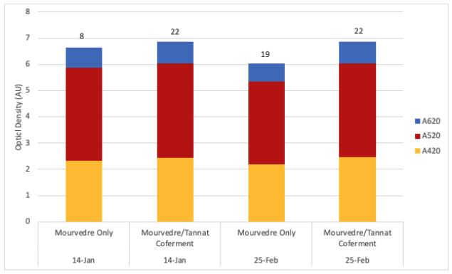 Wine color is influenced by many factors, including pH and SO2. These wines have very similar pH values, and SO2 values (shown as endcaps in Figure 2) were very similar at the 2/25 sampling, which allows some comparisons to be made. In this case, the color intensity (sum of A420, A520 and A620nm readings) is higher in the co-fermented wine. Phenolic measurements are all slightly higher for the co-fermented wine (Table 3). Notably, tannin levels increased from 456 mg/L to 528 mg/L with the addition of Tannat, an increase of 16%. The formation of polymeric anthocyanins, the stable form of anthocyanins, depends on tannin availability. These increased 20% in the co-fermentation with Tannat.