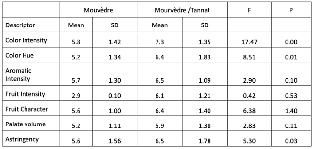 Despite producing full-bodied, meaty wines in its home region, Mourvèdre only enjoys mixed success in Virginia. To increase the body, structure and perception of ripeness in a Mourvèdre-based red wine, this variety was co-fermented with 12% Tannat. The resulting wine had higher measured color intensity and notably higher tannins and polymeric anthocyanins than the 100% Mourvèdre wine. The wines were significantly different in a triangle test, with the cofermented wine receiving higher scores for color intensity, color hue, and astringency.