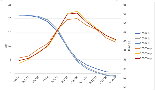 Fruit was harvested with chemistry value indicative of healthy, ripe Viognier (Table 1). Adding lees did not lead to a notable increase in measurable YAN. In each treatment, fermentation progressed in a roust manner with Brix depletion very similar among treatments until the fermentation reached about 5°Brix. At that time, the wine with 100 NTU slowed down sooner than the other treatments (Figure 1). Juice with lower turbidity may have fewer available sterols and, therefore, struggle when sugar is low and ethanol is high. All three fermentations fully completed fermentation, with glucose/fructose of 0.1 g/L by 9/22/25.