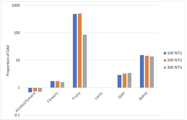 To assess aromatic differences between treatments, 14 esters and acetates were measured. These compounds were grouped into odor active vectors according to Ferreira et al (2022)4 and represented relative to their sensory thresholds, with an odor active value < 1 representing subthreshold levels (Figure 2). For all groups, the alcohol/solvent vector was below threshold. The wine made from juice with 300 NTU had lower concentration of flowery and fruity esters and acetates. This finding is consistent with the idea that juice solids contain esterase enzymes that can degrade fruity esters. This wine also had the highest 3MH but lowest 3MHA, indicating turbidity did not drastically change the aromatic compounds, but may have shifted their balance.