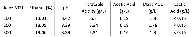 The level of juice turbidity can influence yeast health, fermentation kinetics, and aroma development in white wines. In this experiment, Viognier juice was adjusted to three turbidity levels (<100, 200, and 300 NTU) prior to fermentation. All treatments fermented to dryness with very similar final chemistry. Wines made from higher turbidity juice (300 NTU) showed lower concentrations of fruity and floral esters, consistent with the presence of esterase enzymes in juice solids, though differences were modest. In sensory analysis, there were no significant differences among treatments for fruit intensity, fruit character, palate volume, or reduction. The 100 NTU wine was perceived as less acidic than the others, despite no measurable chemical difference. Overall, varying juice turbidity within the tested range did not strongly impact fermentation performance or sensory outcomes in Viognier.