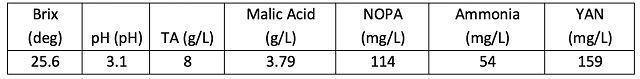 Table 1: Juice chemistry after racking (In-house data)