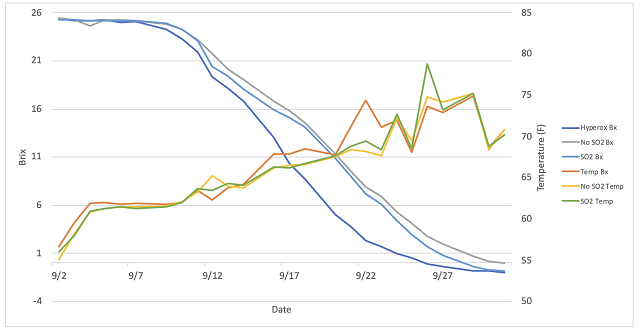 The goal for this wine was to ferment to dryness. Though initially fermentation was on pace, tall three fermentations struggled when they reached Brix levels less than 0. In Petit Manseng, it is common for fermentations to be 1.5 – 2.0 Brix negative before residual sugar is fully utilized. For this reason, fermentations were re-started. Oenocell (0.3 g/L) was added an allowed to settle for 2-3 days. After racking off Oenocell, a pied de cuvée was prepared of water, wine, sugar to 5°Brix, and Fermaid O. Uvaferm 43 Restart yeast (0.4 g/L) was rehydrated in GoFerm (0.5 g/L) according to manufacturer’s instructions for restart rehydration. The pied de cuvée was added after 20 minutes and allowed to acclimate prior to addition to the larger lot of wine. When residual sugar was confirmed to be fully utilized, 30 ppm SO2 was added.