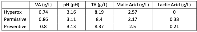 Table 3: End of fermentation for three treatments of Petit Manseng (in-house data)