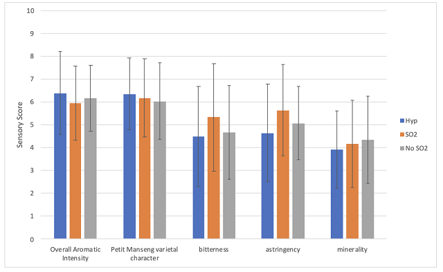 Sensory analysis was completed by a panel of 28 wine producers. Wines were presented blind in randomly numbered glasses. Tasters were presented with three wines and asked to score each wine on a scale of 0 to 10 for overall aromatic intensity, Petit Manseng varietal character, bitterness, astringency and minerality. There were three tasting groups, each tasting the wine in different order. Tasters were also given open ended questions to describe the wines. Descriptive scores were analyzed using repeated measures ANOVA.