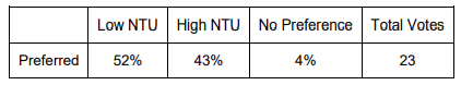 For the triangle test, of 33 people who answered, 23 people chose the correct wine (70%), showing a statistically significant difference between wines (p<0.001). These wines were voted to have an average degree difference of 5.0 (out of 10), suggesting that the wines were moderately different. In general, people who answered correctly showed no major preference for one wine over the other. Some judges noted that the High NTU wine was slightly reduced, and that the Low NTU wine was slightly cleaner. This further supports the possibility of a reducing environment resulting in more free thiols.
