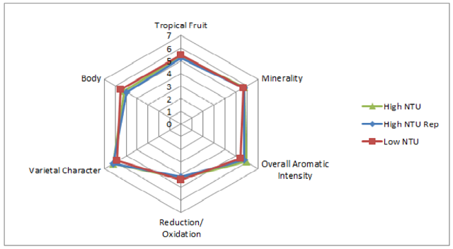 No major trends could be found for the descriptors used in this study, despite the wines being found to be significantly different. There was a slight tendency for the High NTU wine to have more Varietal Character and Overall Aromatic Intensity, while having less Body.