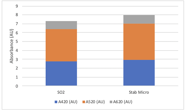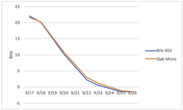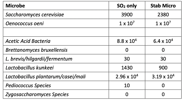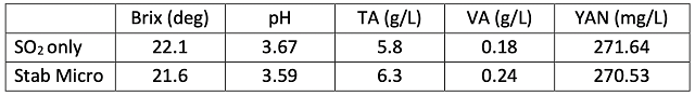 The initial juice chemistry for the two treatments was slightly different, with the Stab Micro lot having lower initial sugar and pH and higher TA (Table 1). This may be due to variation in the vineyard or inherent variation in sampling of non-fermenting red grapes. Fermentations were robust with no differences between treatments (Figure 1). Finished wine chemistry was also very similar with no difference in volatile acidity between the lots (Table 2, Figure 2). Likewise, the microbial load of wine after 4 months of barrel aging was very similar between lots (Table 3), with the Stab Micro treatment having only slightly lower levels of acetic acid bacteria. This treatment also had higher levels of some Lactobacillus microbes (Table 3).