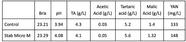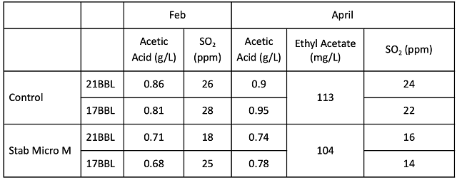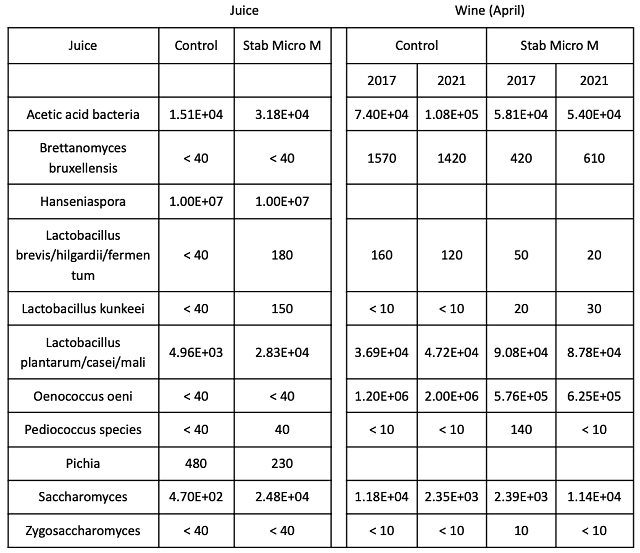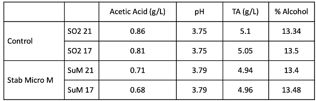 The microbial community was sampled at juice and after wine aging (Table 4). The bin that was treated with chitosan started with higher values for several Lactobacillacea as well as Saccharomyces. In the finished wine, the wine treated with Stab Micro M had slightly lower values for Brettanomyces, Lactobacillus, and Oenococcus. However, with the exception of Oenococcus, these values were very low in both treatments.