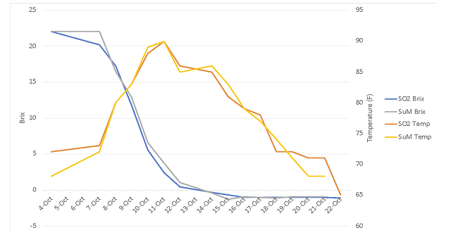 Based on in-house pH values, 3 g/L tartaric acid was added to each bin. Bins were lightly punched down and gassed until signs of fermentation began, after which they received three punchdowns daily. Fermentations were checked for Brix and temperature once daily. At the completion of fermentation, bins were gassed each day before pressing on 10/24 for a total of 23 days of maceration. After pressing, wine was allowed to settle, then transferred to comparable oak barrels for malolactic fermentation. Wine was treated with 70 ppm SO2 on 12/3, at the completion of malolactic fermentation.